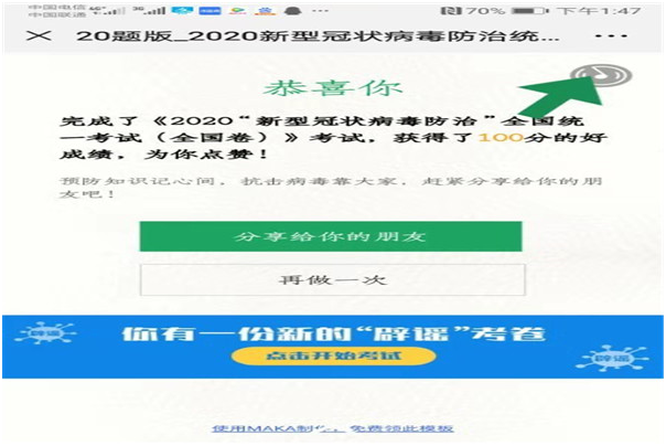 公司纪委书记陈亚军以《新型冠状病毒肺炎防控知识手册》为参考,,,针对易混淆的、、、关键的疫情防控知识,,进行考试题目设计,,,借助微信平台发放答题链接,,呼吁全体党员干部主动学习防疫知识,,,,积极参与竞赛答题。。短短半天时间,,,,尊龙时凯集团50余名党员参与答题,,,,95%获得100分以上的好成绩。。。疫情就是责任,,,,防控就是命令,,,,在这特殊时期,,,,通过此次知识竞赛活动的开展,,,,全体党员干部了解当前的疫情现状,,,,学习疫情相关防护知识,,,,起到了引领大家正确认识疫情,,,,防控疫情的作用。。